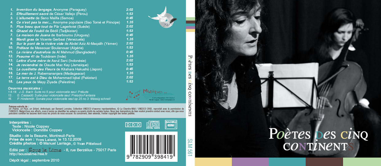 Interprètes :Texte : Nicole CoppeyVioloncelle : Domitille CoppeyUn livret en Braille établi en collaboration avec l'UNESCO peut être obtenu sur demande.Commande directe à 123Musiques... Ecole associée de l'UNESCO