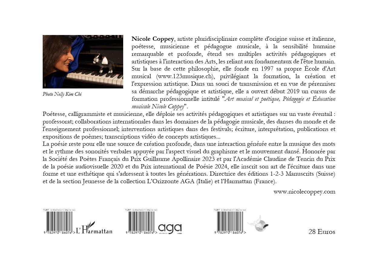 Nicole Coppey, artiste pluridisciplinaire complète d'origine suisse et italienne, poétesse, musicienne et pédagogue musicale à la sensibilité humaine remarquable et profonde, étend ses multiples activités pédagogiques et artistiques à l'interaction des Arts, les reliant aux fondamentaux de l'être humain. Sur la base de cette philosophie, elle fonde en 1997 sa propre École d'Art musical (www.123musique.ch), privilégiant la formation, la création et l'expression artistique. Dans un souci de transmission et en vue de pérenniser sa démarche pédagogique et artistique, elle a ouvert début 2019 un cursus de formation professionnelle intitulé "Art musical et poétique, Pédagogie et Éducation musicale Nicole Coppey".